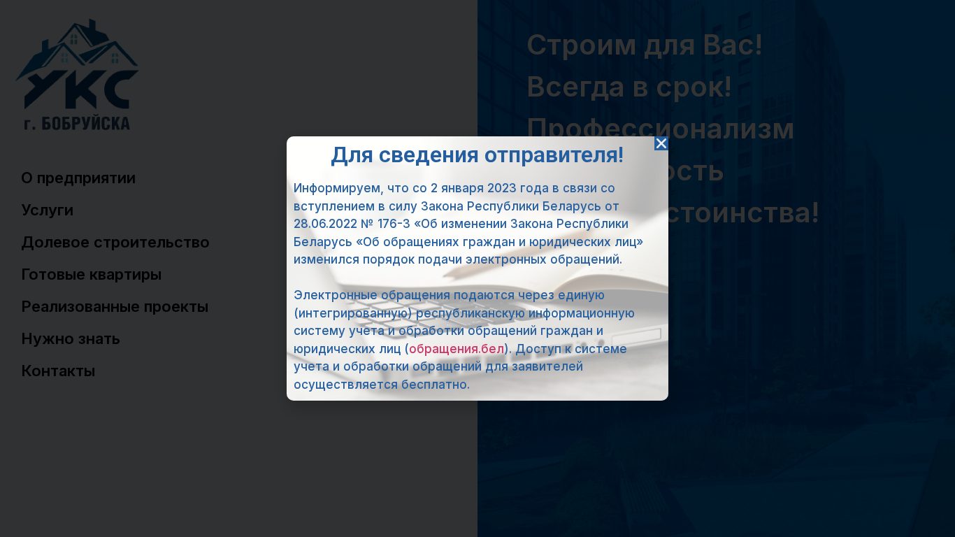 | SEO-описание | Государственное предприятие "УКС г. Бобруйска". Купить квартиру в Бобруйске. Долевое строительство квартир. Квартиры с отделкой и без. |