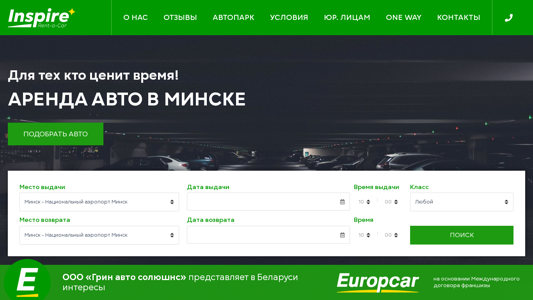 | SEO-описание | Аренда авто без водителя в Минске от официального представителя Europcar в Беларуси. Компания Inspire — большой выбор автомобилей, выгодные условия, превосходный сервис! |