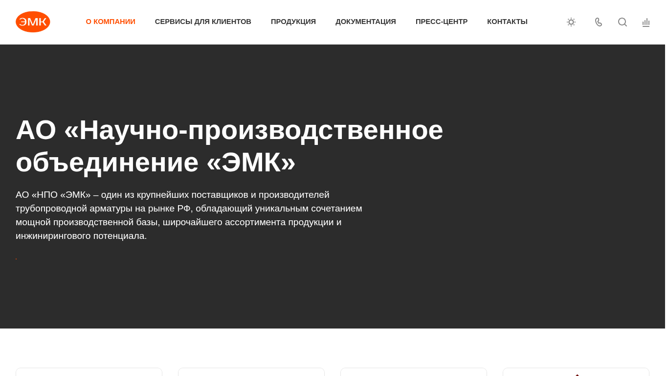 SEO-описаниеАО «НПО «ЭМК» – один из крупнейших поставщиков и производителей трубопроводной арматуры на рынке РФ, обладающий уникальным сочетанием мощной производственной базы, широчайшего ассортимента продукции и инжинирингового потенциала.