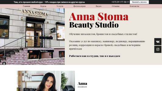 | SEO-описание | Студия Красоты Анны Стома оказывает услуги по макияжу, маникюру, педикюру, наращиванию ресниц, коррекции и окраске бровей, свадебных и вечерним причёскам. Обучение визажистов, бровистов и свадебных стилистов! Анна Стома является основателем студии красоты и ведущим визажистом международного уровня с опытом работы более 12 лет. Действующим преподавателем в собственной школе макияжа «Anna Stoma Beauty Studio» Непрерывно повышает свою квалификацию, проходит различные стажировки, мастер-классы и семинары. |