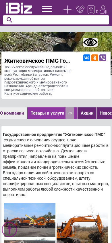 | Название / Заголовок | Житковичское ПМС Государственное предприятие - Техническое обслуживание, ремонт и эксплуатация мелиоративных систем по всей Республике Беларусь. Ремонт, реконструкция объектов гидротехнического и мелиоративного назначения. Аренда автотранспорта и специализированной техники. Культуртехнические работы.. 247960, Житковичи, , Фрунзе, 107 |