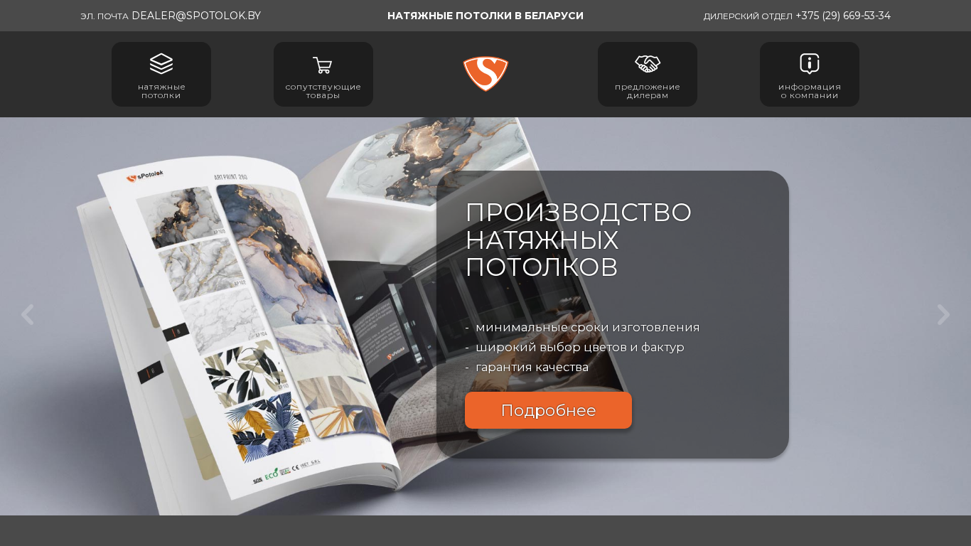 | SEO-описание | Заказать натяжные потолки в Минске от производителя - низкие цены, огромный выбор, гарантия, монтаж за 4 часа - sPotolok.by |
