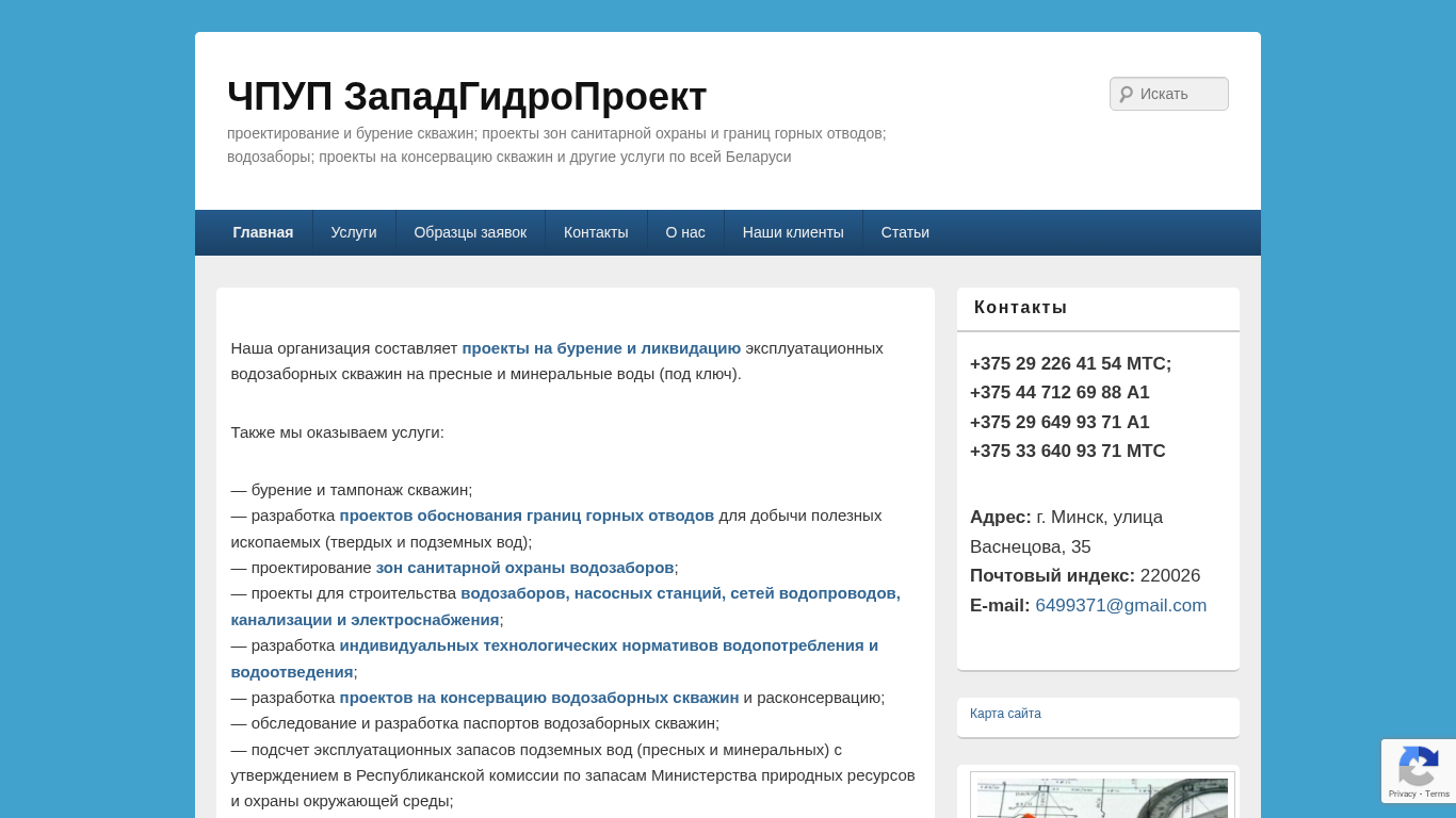 | SEO-лексика | скважин проекты услуги проект станций водозаборных охраны бурение санитарной воды чпуп западгидропроект разработка все 375 зон консервацию другие беларуси нормативов |