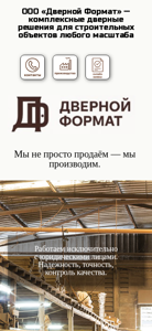 | SEO-описание | ООО «Дверной Формат» — комплексные дверные решения для строительных объектов любого масштаба Мы не просто продаём — мы производим. Работаем исключительно с юридическими лицами. Надежность, точность, контроль качества. Мы производим и поставляем межкомнатные, комбинированные и противопожарные двери, адаптированные под индивидуальные размеры. Закрываем все дверные потребности объекта — от эконом-сегмента до решений с повышенными требованиями к |