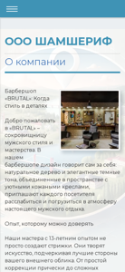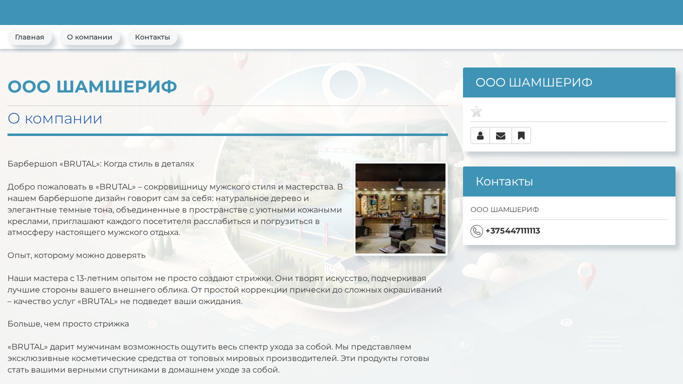| AI-анализ | The portal brutal.vrb.by is a website for a barber shop named "BRUTAL" with a company registration titled "ООО ШАМШЕРИФ" located in Minsk, Belarus at ul. Комсомольская, 34. The site features a minimalist design with a dark color scheme, natural wood accents, and comfortable leather chairs to create a relaxing atmosphere for male customers. The shop boasts a team of experienced barbers with over 13 years of expertise, offering a range of services from simple haircuts to intricate coloring treatments. The domain is part of the vrb.by network, and the code reveals elements of customization and optimization for improved user experience. |