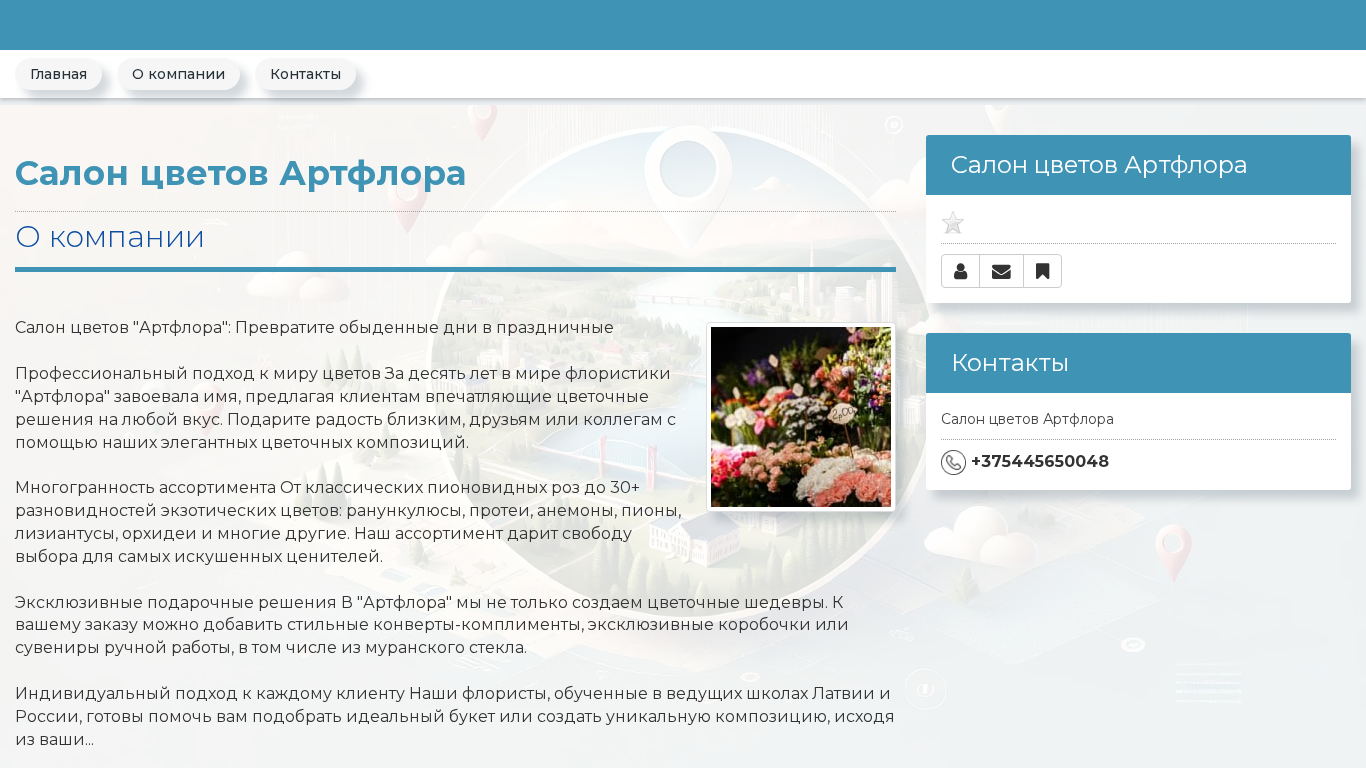 | AI-анализ | --- The portal artflora.vrb.by, titled "Салон цветов Артфлора", is a website dedicated to a flower shop located in Minsk, Belarus, at the address Дзержинского проспект, 24, with the phone number +375445650048. The website provides information about the company and its contacts. The top keywords on the website include "цветов" (flowers), "артфлора" (the name of the shop), "салон" (salon), and "компании" (company). The website offers a professional approach to the world of flowers, providing various flower solutions for different tastes. The extensive assortment ranges from classic roses to over 30 exotic varieties, such as ranunculus, protea, anemone, peony |