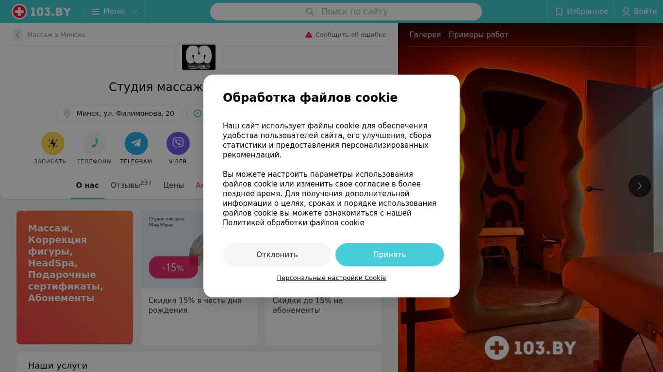 | SEO-описание | Студия массажа Мни Меня Минск ул. Филимонова 20 – телефоны, время работы, отзывы и схема проезда в каталоге медицинского портала 103.by. |
