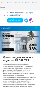 | AI-анализ | The website "PROFILTER" is an online store specializing in the sale of various filters. The top words used on the site include "фильтры" (filters), "375" (presumably a currency code), "гейзер" (geyser), "руб" (ruble), and "количество" (quantity), suggesting that the products offered are primarily related to water filtration systems. The website imports several CSS files from different modules, such as date, ubercart, and yandex_metrics, indicating the use of various functionalities including shopping cart and web analytics. The HTML code includes styles for iOS devices and touch screens, suggesting that the website is optimized for mobile devices. The title of the website is "PROFILTER". |