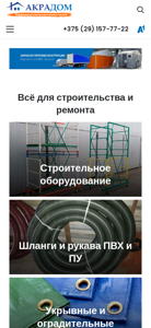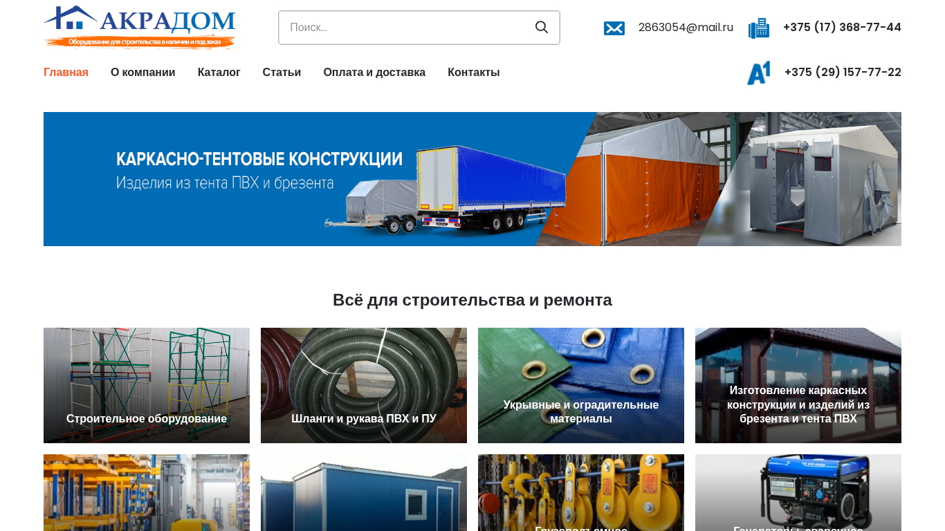 | AI-анализ | The website akradom is a business platform showcasing various equipment, PVC materials, and construction supplies. The site utilizes the best-rated WordPress theme and offers an extensive catalog for users to build an impressive website. Keywords associated with the website include "оборудование" (equipment), "пвх" (PVC), "контакты" (contacts), "статьи" (articles), "компании" (companies), and "водонагреватели" (water heaters), among others. The website also features a catalog section, with categories such as "строительное оборудование" (construction equipment) and "укрывные материалы" (covering materials). The website includes a contact section, with phone numbers "368-77-44" and "286305 |