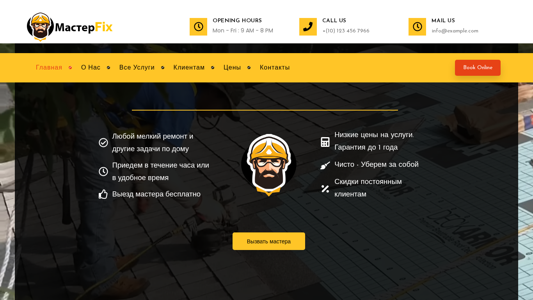 | AI-анализ | The portal Masterfix.by is a home services marketplace offering various repair and improvement services in Minsk, Belarus. With a focus on plumbing, carpentry, electrical, painting, renovation, heating, roofing, and flooring, Masterfix.by enables users to book services online or contact the company via phone or email. The website features a gallery for showcasing completed projects and offers information on pricing, team members, and branches. Users can also find a menu for easy navigation and an estimator tool for requesting quotes. The website's design employs a clean and modern aesthetic, with a clear call-to-action for users to request a master's visit. The portal operates from 9 AM to 8 PM, Monday through Friday. |