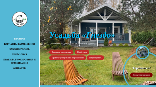 | AI-анализ | This website is for a rural estate called "Гнездо" (Nest in English), offering rental homes. The home rental options include two separate houses and the entire estate, with different capacities and additional services. Prices range from 750 to 1000 rubles per day. Each rental includes exclusive use of the entire property. A discount of 10% is given for bookings longer than three days. Contact information is provided, along with a price list and booking rules. Social media links to Instagram are also included. |