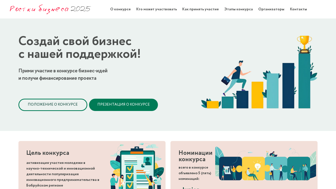 | AI-анализ | This online resource is dedicated to the Business Growth 2025 contest in Bobruisk, Belarus. The website aims to encourage youth participation in scientific-technical and innovative activities and promote innovative entrepreneurship in the city. The contest offers a prize fund of up to 500,000 rubles for selected projects in five categories: Junior (best youth business idea), Creative (technologies in media, design, culture), TechNet (advanced production technologies), IoT (Internet of Things), and SocialTech (best social project). Eligible participants include physical individuals residing or planning to register in Bobruisk, as well as legal entities with a staff of no more than 15 people and having operated for less than 5 years. Interested parties can submit their applications by filling out three forms: registration form, project description, and personal data consent form. The contest consists of three |