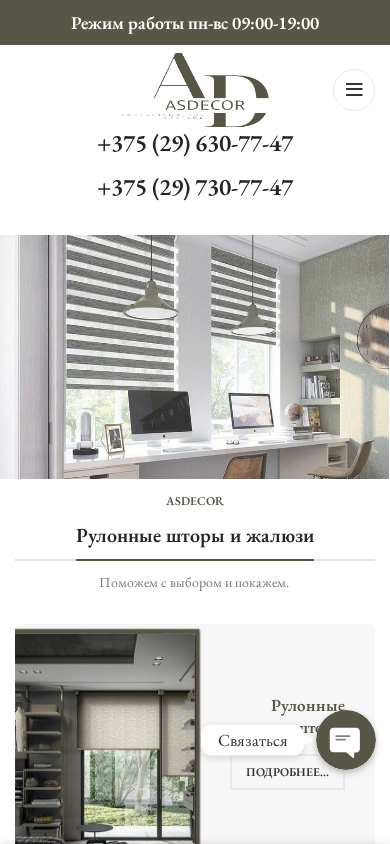 | AI-анализ | This online resource is a website for purchasing roll-up shades and blinds from the Belarusian company Asdecor. The site offers custom manufacturing and provides a full catalog of models. Contact information for ordering is provided, with operating hours listed as Monday through Sunday from 9:00 to 19:00, and phone numbers given as +375 (29) 630-77-47 and +375 (29) 730-77-47. The site includes categories for various types of roll-up shades and blinds, including day-night shades, padded shades, vertical and horizontal blinds, shades with photo printing, and rimless shades. Asdecor combines the features of blinds and shades in its products, with the operating principle being similar to that of blinds. The site also features a section |