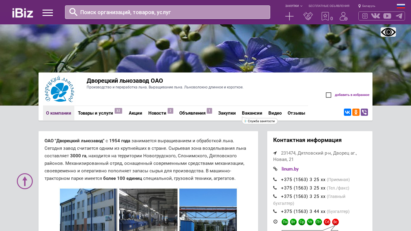 Название / Заголовок | Дворецкий льнозавод ОАО - Производство и переработка льна. Выращивание льна. Льноволокно длинное и короткое.. 231474, , Дворец аг., Новая, 21 |