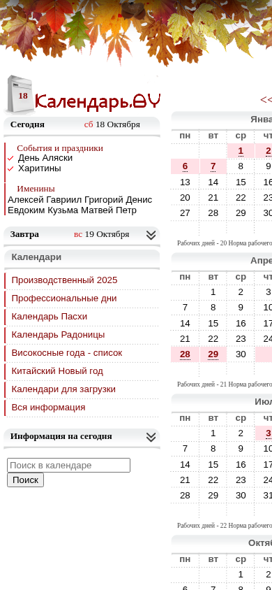 | SEO-описание | 2025 Календарь праздничных дней в Беларуси. Производственный календарь на 2025 год. Государственные и религиозные праздники Беларусии. Именины. $name |
