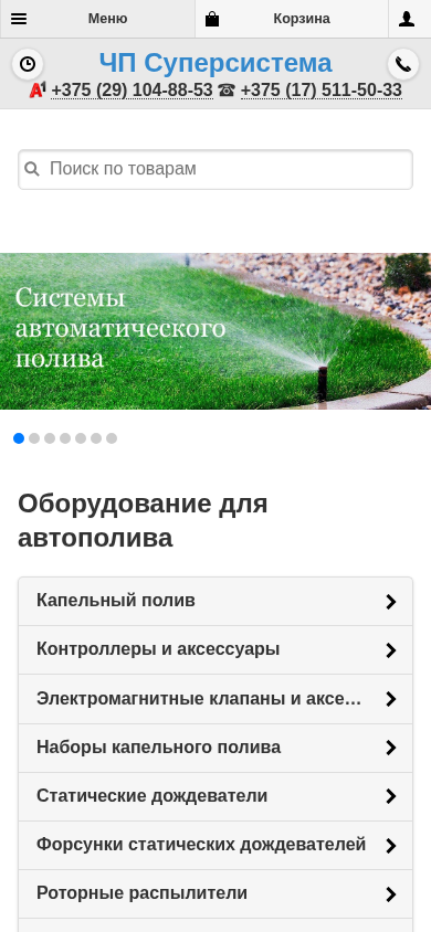 | AI-анализ | language: ru The web project "Equipment for automatic car washing systems. An e-commerce website named CP Supersystema offers a catalog of equipment for car washing systems using the method of capillary irrigation. The site provides information on various components of such systems, including capillary hoses, fittings, nozzles, pressure regulators, and timers. It also offers controllers and accessories, such as electromagnetic valves and hose connectors. The site features a shopping cart and a registration form for buyers, as well as contact information, including phone numbers and an email address. The store sells products such as a capillary tube, K-Rain irrigation components, a rotating sprinkler valve, and a rat guard. The store operates from Monday to Saturday, with hours from 08:00 to 19:00, and on |
