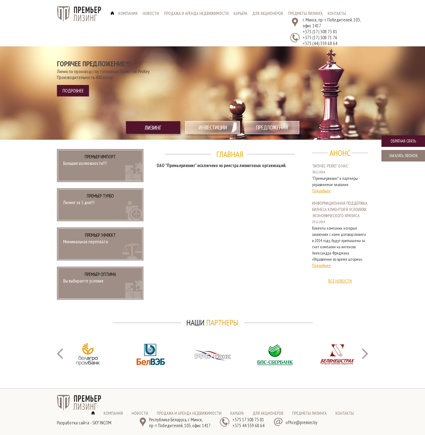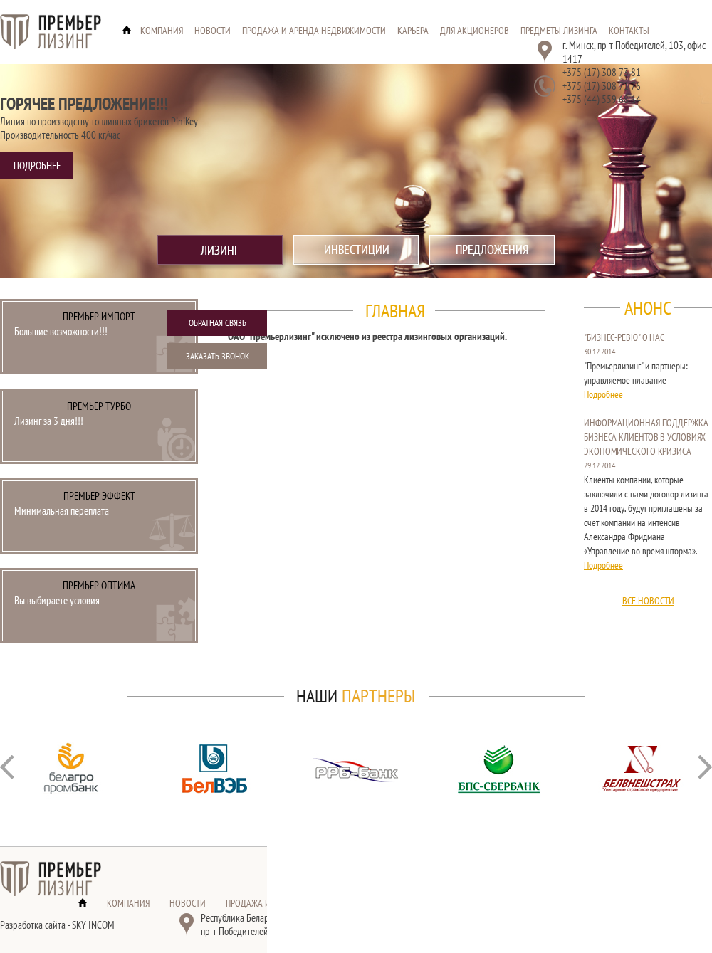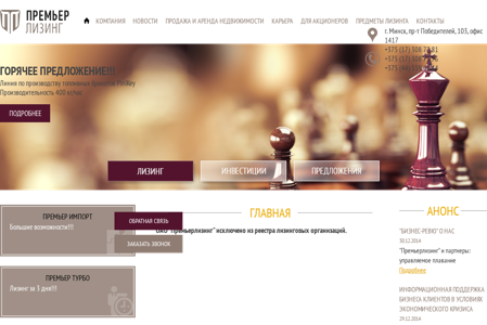 AI-анализ | The portal is a website of a leasing company, Премьерлизинг, which is primarily focused on providing leasing services for various types of assets, including real estate, vehicles, equipment, and specialized machinery. The company's official name is ОАО "Премьерлизинг", which is no longer listed in the register of leasing organizations. The website features news, company information, and career opportunities, as well as a section for customers to order a call back. The top keywords on the website are "итоги", "года", "лизинг", and "премьер", suggesting that the company's main focus is on providing leasing services and reporting its achievements and results. The website is based in Belarus, with its official address in Minsk, and can be contacted through phone numbers or email. The website also features various news articles, including an announcement from "Бизнес-ревю" and information about the company's social responsibility initiatives |