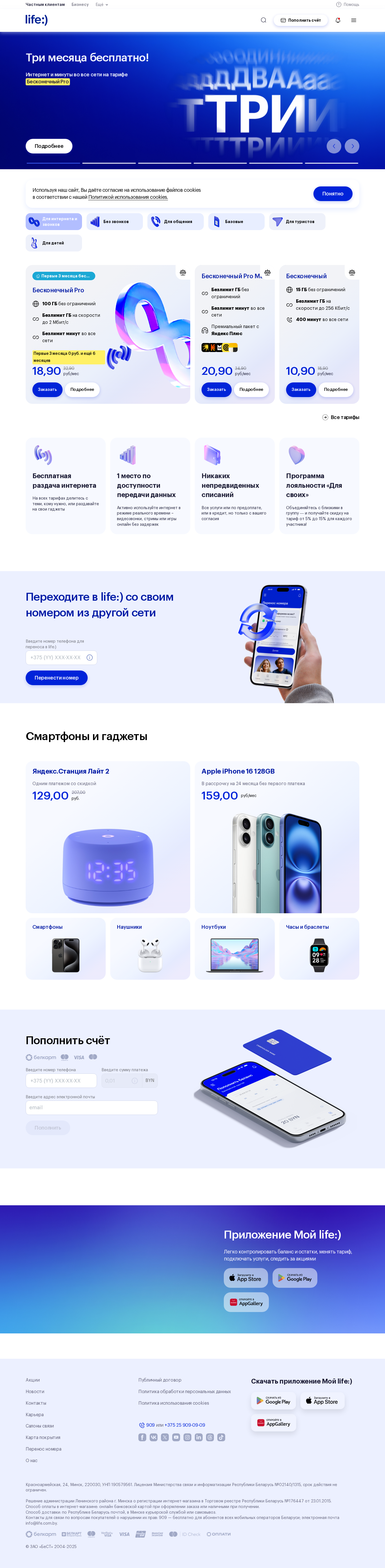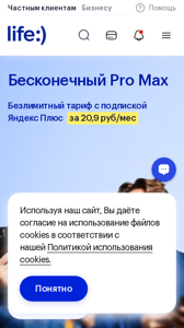 AI-анализ | Mobile operator life:) offers various tariffs for individual and business clients. Some tariffs include unlimited usage for three months at zero rubles, followed by monthly payments of 18.90 or 30.90 rubles. Other tariffs offer different amounts of data and minutes for various prices, with options for adding additional services. The operator covers the entire country with its network and offers a loyalty program called "For Yourself." The website includes a construction tool for customizing tariffs, an online store for services and subscriptions, and the option to transfer a number to life:). The website also offers various popular tariffs, including 'Endless Pro' with unlimited data and minutes, and 'Endless Pro Max' with premium add-ons. Other tariffs offer varying amounts of data and minutes, as well as options for 'Smart Things' and 'Voice' services. The operator's |