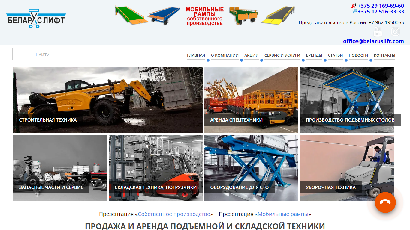 AI-анализ | This website is about renting and selling lifting and storage equipment in Minsk, Belarus. The company offers new and used items, delivery throughout Belarus, and attractive leasing options with low prices. Brands include BP, Faresin, Haulotte, Linde, Maeda, Niftylift, CVS Ferrari, and Zallys, among others. The company also produces its own brand, "Belaruslift," offering lifting tables, consoles, mobile ramps, stackers, and other items. Founded in 1997, the company initially sold lifting equipment for car workshops, and later expanded to include heavy lifting equipment and warehouse equipment. Today, the company employs over 80 specialists and has several main areas of business. |