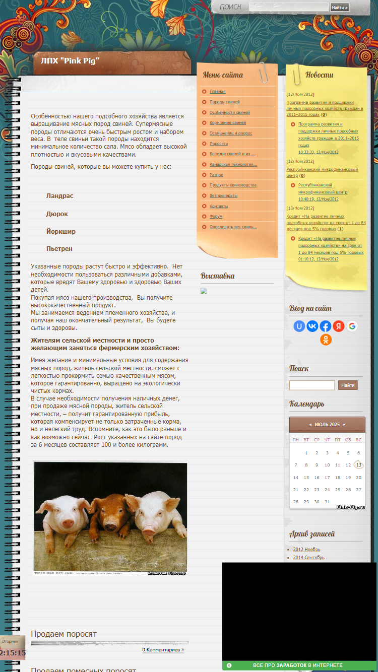 AI-анализ | At ucoz.de — Pink Pig Farm — Home: Pink Pig Farm specializes in the breeding of meat-type pigs with rapid growth and high lean meat yield, providing lean meat of high quality. The farm offers the Landrace, Duroc, Yorkshire, Pietrain, and Porcilis breeds, including Landrace-Duroc crosses. Pigs are available for sale with financing options for agritourism and personal backyard farming. The site provides information on the characteristics of the breeds and the development programs for pig farming. Keywords: meat breeds, pig farming, rapid growth, lean meat, Landrace, Duroc, Yorkshire. |
