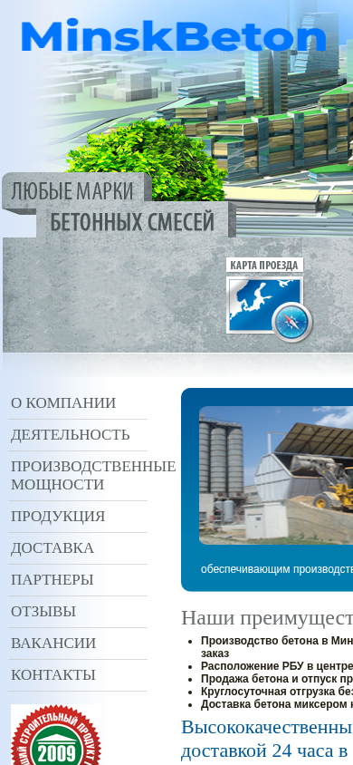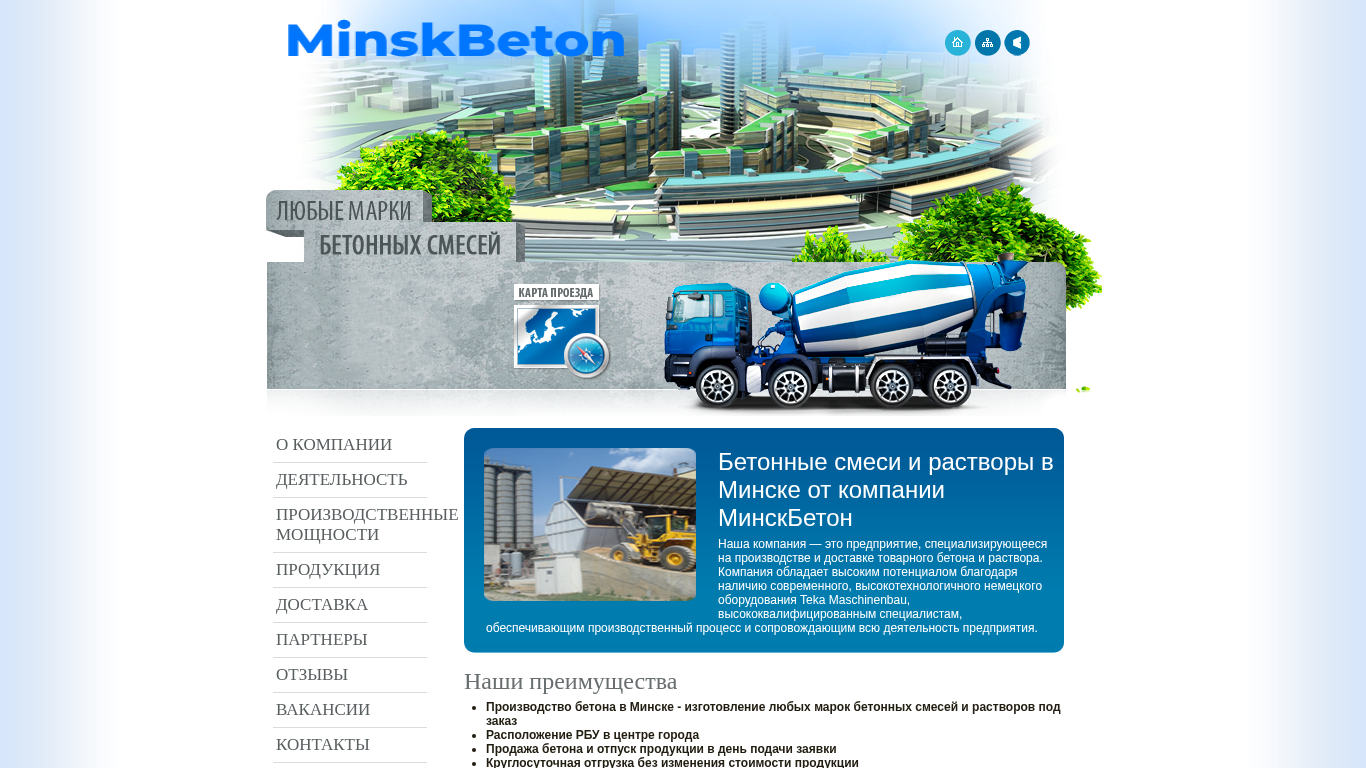 | SEO-описание | Компания МинскБетон производит бетон строительный, производство бетонных смесей налажено в центре города с последующей доставкой бетона миксером по Минску в указанные сроки. |