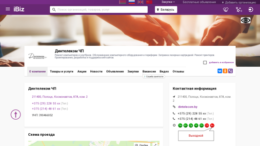 Название / Заголовок | Динтелеком ЧП - Ремонт компьютеров и ноутбуков. Обслуживание компьютерного оборудования и периферии. Заправка лазерных картриджей. Ремонт принтеров. Проектирование, разработка и поддержка веб-сайтов.. 211400, Полоцк, , Космонавтов, 87А, ком. 2 |