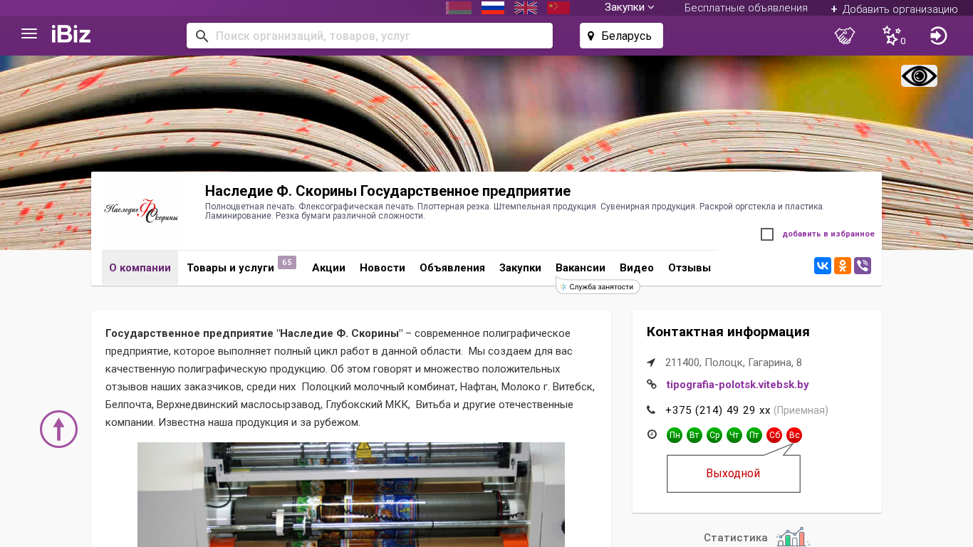 Название / Заголовок | Наследие Ф. Скорины Государственное предприятие - Полноцветная печать. Флексографическая печать. Плоттерная резка. Штемпельная продукция. Сувенирная продукция. Раскрой оргстекла и пластика. Ламинирование. Резка бумаги различной сложности.. 211400, Полоцк, , Гагарина, 8 |