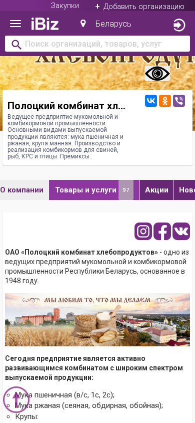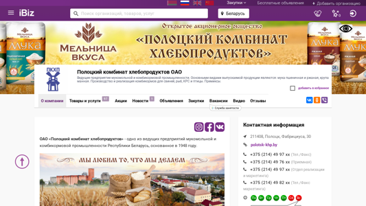 Название / Заголовок | Полоцкий комбинат хлебопродуктов ОАО - Ведущее предприятие мукомольной и комбикормовой промышленности. Основными видами выпускаемой продукции являются: мука пшеничная и ржаная, крупа манная. Производство и реализация комбикормов для свиней, рыб, КРС и птицы. Премиксы.. 211408, Полоцк, , Фабрициуса, 30 |