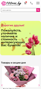 | AI-анализ | The web project "100roz.by" is an online flower shop based in Minsk, Belarus, offering a wide range of flowers, bouquets, and potted plants for delivery within the city. Customers can choose from various types of bouquets, monobouquets, flowers sold individually, edible bouquets, wedding bouquets, and bouquets made of dried flowers. The shop also offers home decor items, gifts, and various accessories. The website features a search function and product filters, allowing users to easily find specific items. The shop's address and contact information are provided, including a telephone number and links to Telegram and Viber. The website is open daily from 9:00 to 20:00. At the time of access, there were no products in the cart, and the total cost was 0 rubles. |