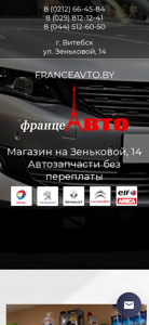| AI-анализ | --- The web project "ФранцеАвто.BY" is a garage parts store specialized in French car models and other brands. According to the provided data, the store offers both original and generic parts of various pricing categories. The keywords suggest that the store stocks auto parts for Peugeot, Renault, and other automobile brands. The top words indicate that visitors frequently search for availability and contact information, as well as filters and systems, particularly for brake and torso parts. The store is located in Vitsebsk, Belarus, on Zhenkovskaya Street 14, and can be reached via several phone numbers. The store's description emphasizes its extensive experience and knowledgeable staff, as well as long-standing partnerships with suppliers and competitive pricing. The site also offers used parts in good condition for lower prices. The store caters to both physical and legal entities and provides a warranty on |