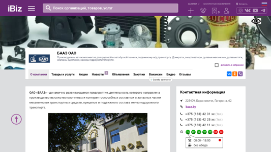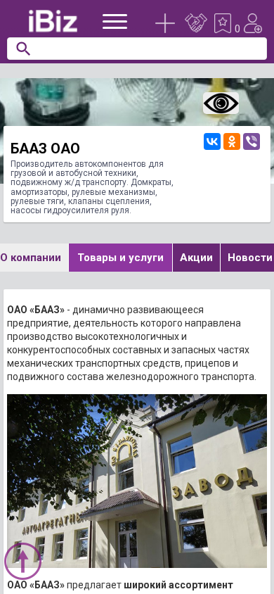 Название / Заголовок | БААЗ ОАО - Производитель автокомпонентов для грузовой и автобусной техники, подвижному ж/д транспорту. Домкраты, амортизаторы, рулевые механизмы, рулевые тяги, клапаны сцепления, насосы гидроусилителя руля. . 225409, Барановичи, , Гагарина, 62 |