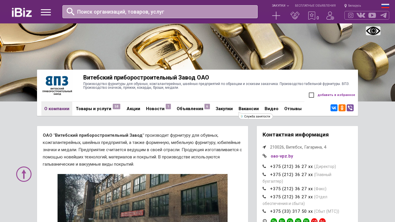 Название / ЗаголовокВитебский приборостроительный Завод ОАО - Производство фурнитуры для обувных, кожгалантерейных, швейных предприятий по образцам и эскизам заказчика. Производство табельной фурнитуры. ВПЗ. Производство значков, пряжки, кокарды, броши, медали.. 210026, Витебск, , Гагарина, 4