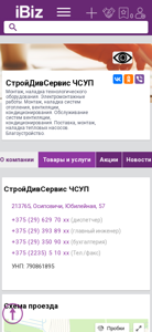 Название / Заголовок | СтройДивСервис ЧСУП - Монтаж, наладка технологического оборудования. Электромонтажные работы. Монтаж, наладка систем отопления, вентиляции, кондиционирования. Обслуживание систем вентиляции, кондиционирования. Поставка, монтаж, наладка тепловых насосов. Благоустройство.. 213765, Осиповичи, , Юбилейная, 57 |