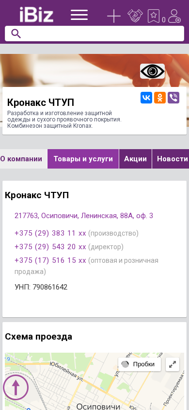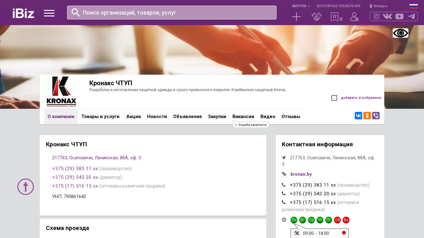 Название / Заголовок | Кронакс ЧТУП - Разработка и изготовление защитной одежды и сухого проявочного покрытия. Комбинезон защитный Kronax.. 217763, Осиповичи, , Ленинская, 88А, оф. 3 |