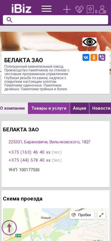 SEO-описание | БЕЛАКТА ЗАО - Полноценный камнепильный завод. Производство памятников на станках с числовым программным управлением. Глубокая резьба по камню, надписи с покрытием настоящим золотом. Памятники одиночные. Памятники двойные. Памятники тройные и более. . Схема проезда, контактные телефоны, адрес компании БЕЛАКТА ЗАО. 225331, Барановичи, , Вильчковского, 182Г |