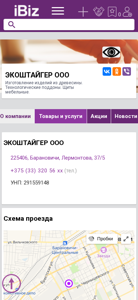 | AI-анализ | This online resource is dedicated to the Belarusian company ЭКОШТАЙГЕР ООО, which specializes in the production of wooden items, technological stands, and furniture shields. The company's address is in Baranovichi, Lermontova Street, number 37/5. The contact information includes a phone number with the code +375 (33) 320 56 xx. The business hours are from 9:00 to 18:00, Monday through Friday, with Saturdays and Sundays being days off. The company's UNP number is 291559148. The website provides information about the company, its products and services, as well as contact details and business hours. |