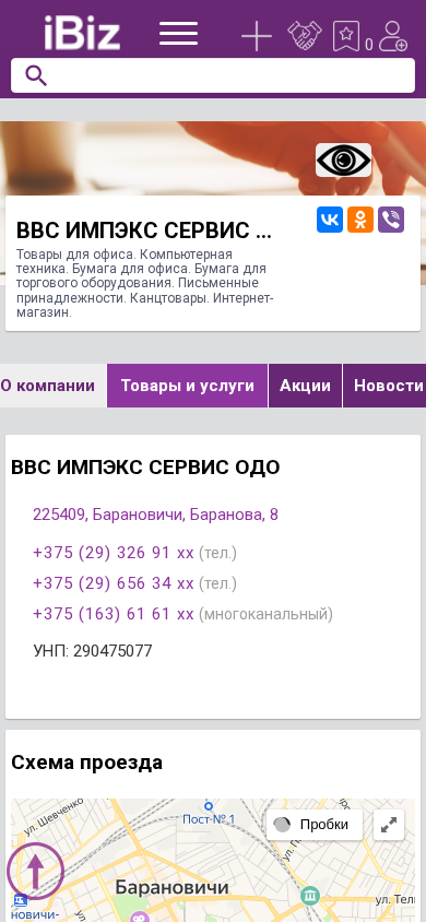Название / Заголовок | ВВС ИМПЭКС СЕРВИС ОДО - Товары для офиса. Компьютерная техника. Бумага для офиса. Бумага для торгового оборудования. Письменные принадлежности. Канцтовары. Интернет-магазин.. 225409, Барановичи, , Баранова, 8 |