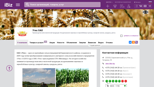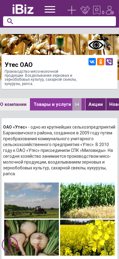 Название / Заголовок | Утес ОАО - Производство мясо-молочной продукции. Возделывание зерновых и зернобобовых культур, сахарной свеклы, кукурузы, рапса.. 225353, , Утес д., Гагарина, 53 |