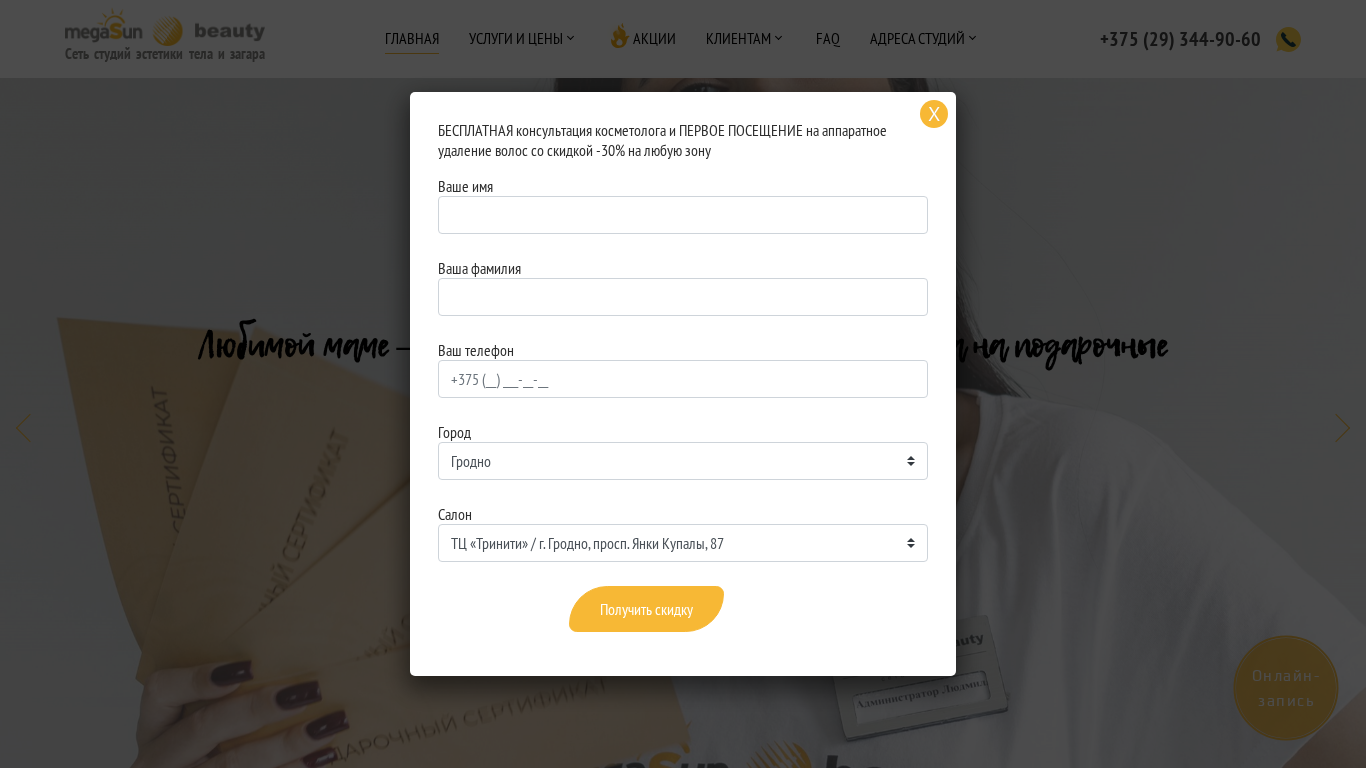 SEO-описание | Бьюти студия MegaSun Beauty в Гродно. ☀️ Солярий Мегасан, эпиляция, массаж, коррекция фигуры, косметические процедуры. 📞 Звоните и записывайтесь в салон красоты по номеру +375 (29) 344-90-60 |