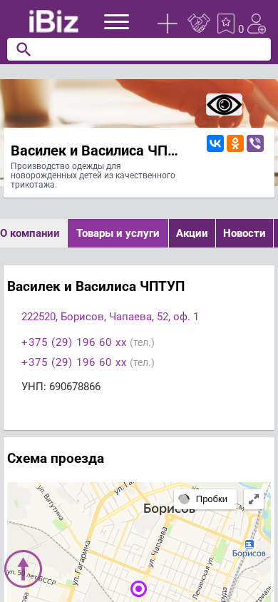 Название / Заголовок | Василек и Василиса ЧПТУП - Производство одежды для новорожденных детей из качественного трикотажа. . 222520, Борисов, , Чапаева, 52, оф. 1 |