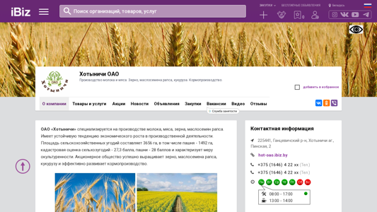 Название / Заголовок | Хотыничи ОАО - Производство молока и мяса. Зерно, маслосемена рапса, кукуруза. Кормопроизводство.. 225441, , Хотыничи аг., Пинская, 2 |