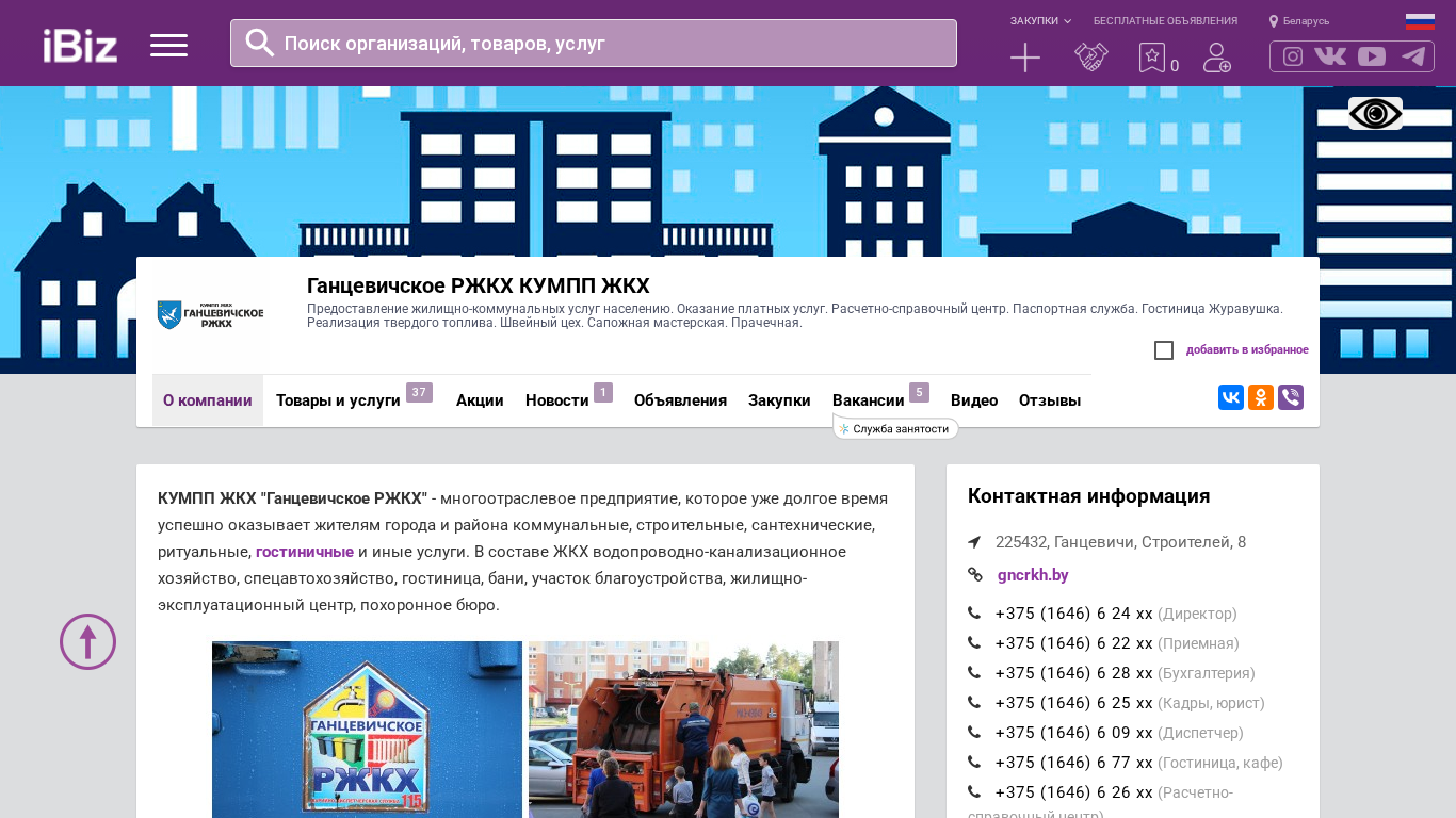 Название / Заголовок | Ганцевичское РЖКХ КУМПП ЖКХ - Предоставление жилищно-коммунальных услуг населению. Оказание платных услуг. Расчетно-справочный центр. Паспортная служба. Гостиница Журавушка. Реализация твердого топлива. Швейный цех. Сапожная мастерская. Прачечная.. 225432, Ганцевичи, , Строителей, 8 |