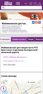 Название / Заголовок | Жабинковская дистанция пути РУП Брестское отделение Белорусской железной дороги - Обеспечение содержания всех элементов пути в состоянии, обеспечивающем безопасное, плановое и бесперебойное движение поездов с установленными скоростями.. 225101, Жабинка, , Школьная, 4 |