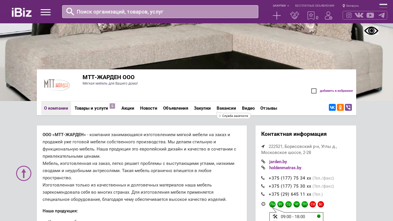 SEO-описание | МТТ-ЖАРДЕН ООО - Мягкая мебель для Вашего дома!. Схема проезда, контактные телефоны, адрес компании МТТ-ЖАРДЕН ООО. 222521, , Углы д., Московское шоссе, 2-28 |