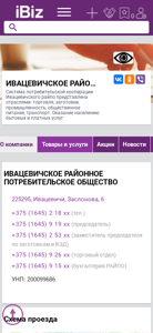 Название / Заголовок | ИВАЦЕВИЧСКОЕ РАЙОННОЕ ПОТРЕБИТЕЛЬСКОЕ ОБЩЕСТВО - Система потребительской кооперации Ивацевичского райпо представлена отраслями: торговля, заготовки, промышленность, общественное питание, транспорт. Оказание населению бытовых и платных услуг.. 225295, Ивацевичи, , Заслонова, 6 |