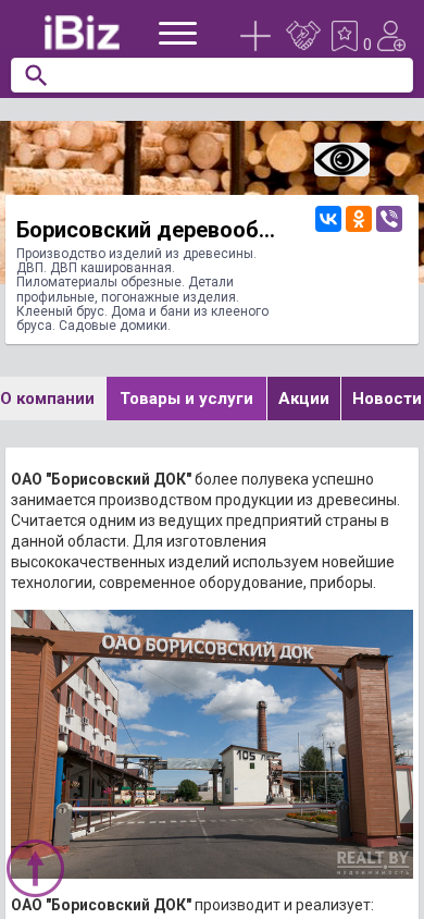 Название / Заголовок | Борисовский деревообрабатывающий комбинат ОАО - Производство изделий из древесины. ДВП. ДВП кашированная. Пиломатериалы обрезные. Детали профильные, погонажные изделия. Клееный брус. Дома и бани из клееного бруса. Садовые домики.. 222120, Борисов, , Заводская, 45 |