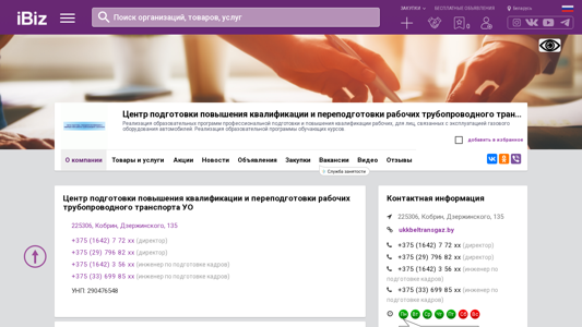 Название / Заголовок | Центр подготовки повышения квалификации и переподготовки рабочих трубопроводного транспорта УО - Реализация образовательных программ профессиональной подготовки и повышения квалификации рабочих, для лиц, связанных с эксплуатацией газового оборудования автомобилей. Реализация образовательной программы обучающих курсов.. 225306, Кобрин, , Дзержинского, 135 |