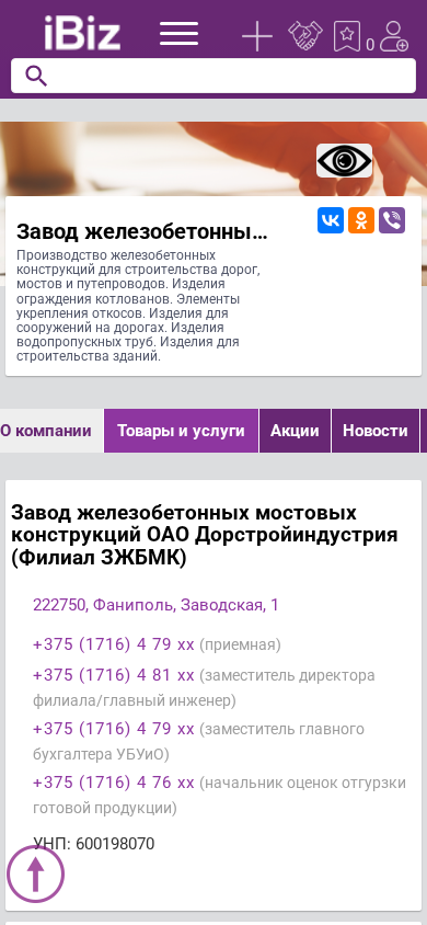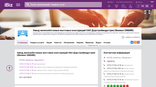 Название / ЗаголовокЗавод железобетонных мостовых конструкций ОАО Дорстройиндустрия (Филиал ЗЖБМК) - Производство железобетонных конструкций для строительства дорог, мостов и путепроводов. Изделия ограждения котлованов. Элементы укрепления откосов. Изделия для сооружений на дорогах. Изделия водопропускных труб. Изделия для строительства зданий.. 222750, Фаниполь, , Заводская, 1