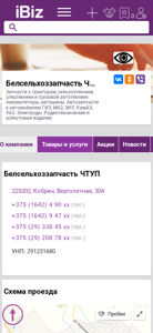 Название / Заголовок | Белсельхоззапчасть ЧТУП - Запчасти к тракторам, сельхозтехнике, спецтехнике и грузовой автотехнике. Аккумуляторы, автошины. Автозапчасти к автомобилям ГИЗ, МАЗ, ЗИЛ, КамАЗ, УАЗ. Электроды. Радиотехнические и асбестовые изделия. . 225302, Кобрин, , Вертолетная, 30А |