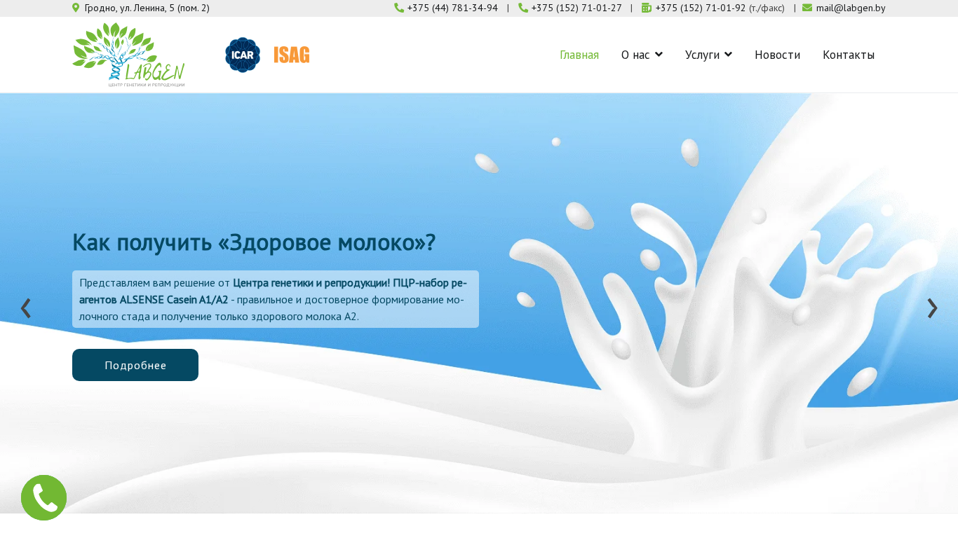 SEO-описание | Филиал «Центр генетики и репродукции LABGEN» ООО «Альгимед Техно» | ДНК-диагностика наследственных заболеваний крупного рогатого скота | ДНК-типирование КРС по генам | Генетическая экспертиза сельскохозяйственных животных путем анализа ДНК | Определение генов, ответственных за наследственные заболевания и за хозяйственно-полезные признаки животных | Диагностика возбудителей вирусно-инфекционных заболеваний животных| Гродно, ул. Ленина, 5 (пом. 2) | +375 (44) 781-34-94, +375 (152) 71-01-27, +375 (152) 71-01-92 (т./факс), mail@labgen.by |